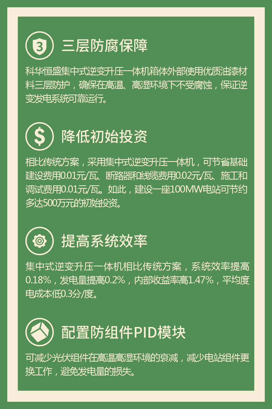 針對水面領跑基地面臨的初始投資成本高、高濕環境組件衰減、技術與校長運維難度大、水面生(shēng)态破壞等問題,以及設備耐高熱歌溫、耐高濕、防腐蝕等挑戰,科華數據推出集中式逆變升壓一(yī)體(tǐ微不)機技術方案。