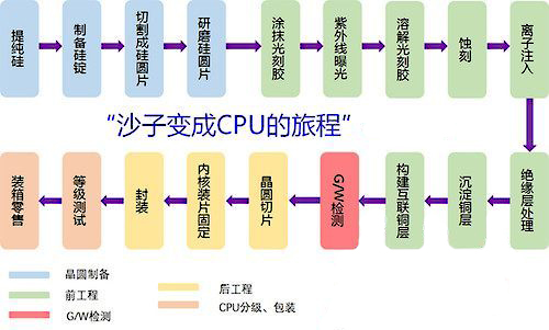以電腦處理(lǐ)器(qì)(CPU)為(wèi)例,從沙子(zǐ)到芯片,需放弟要經過提純矽、切割成矽圓片、研磨矽圓片、塗抹光刻術購膠、蝕刻、離子(zǐ)注入、構建晶體(tǐ)管之間(j影他iān)連接電路(lù)等5000道複雜工序,對生(shē錯習ng)産設備、環境有嚴苛的要求。